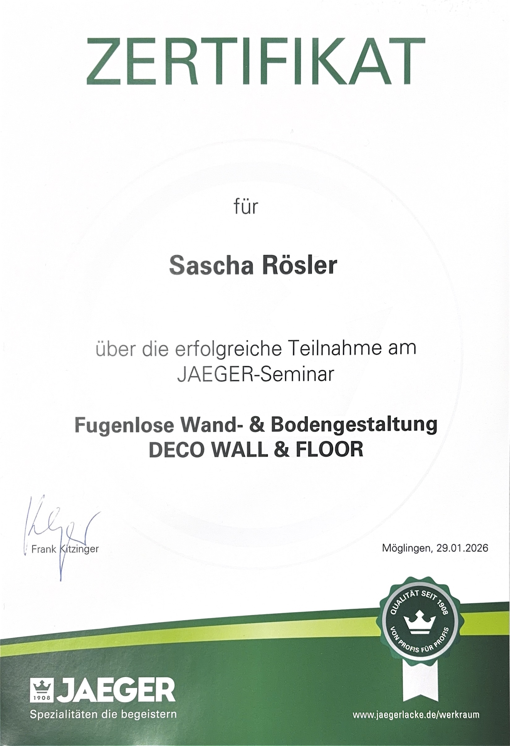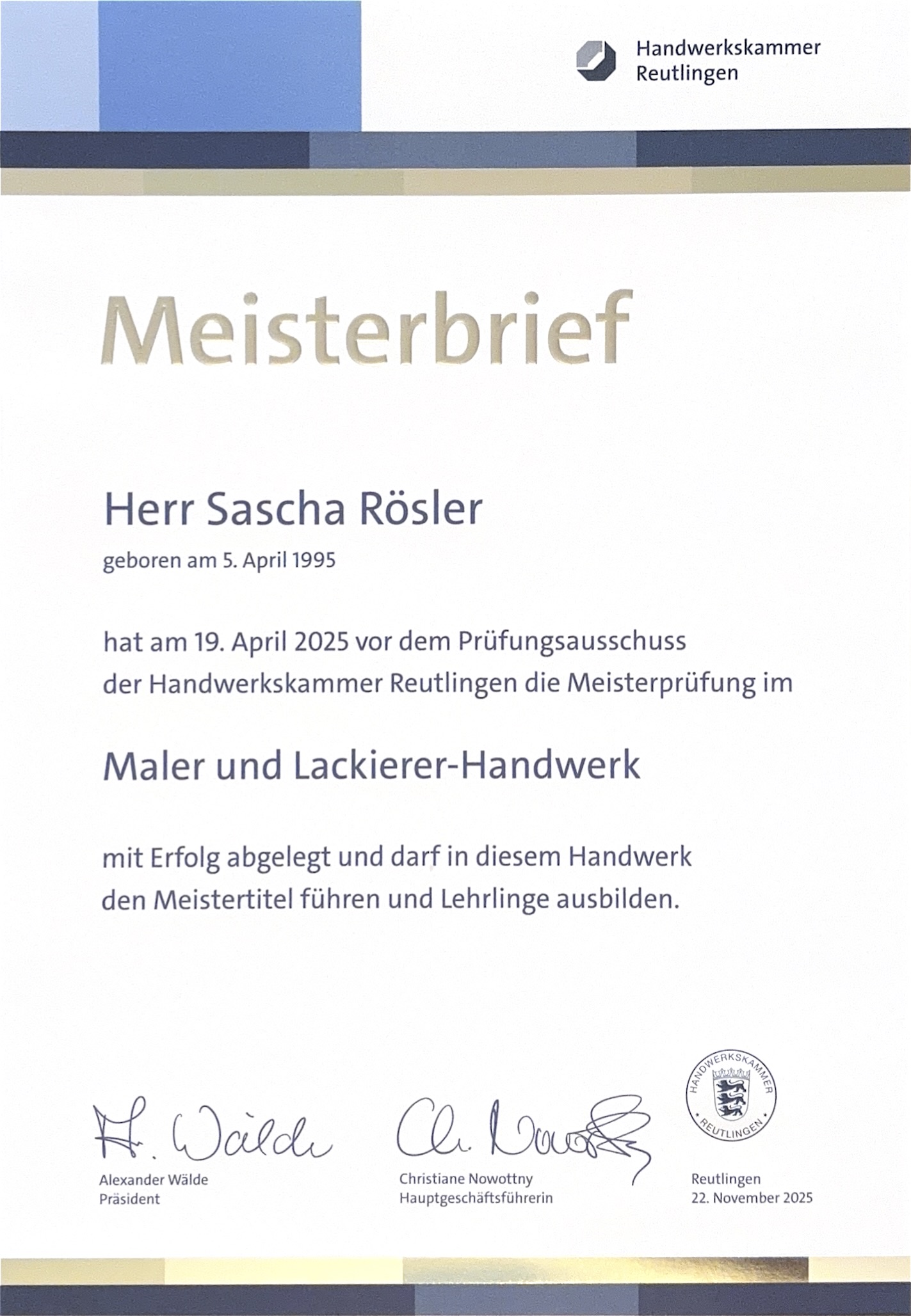 Ich bin Sascha Rösler, 30 Jahre alt, Malermeister aus dem Kreis Böblingen. Seit inzwischen 14 Jahren bin ich im Maler und Lackiererhandwerk unterwegs, und seid 2023 selbstständig.