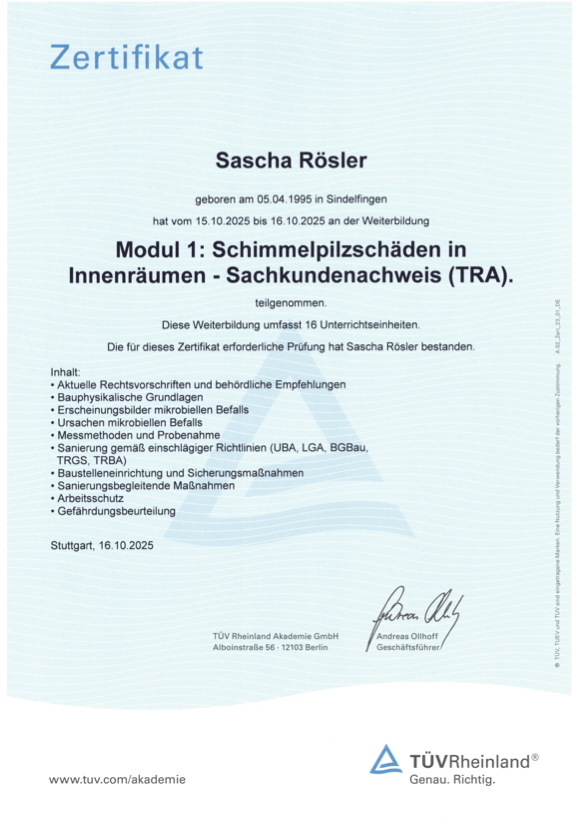 Gerade bei Schimmel geht es nicht um Kosmetik. Da braucht es Analyse, sauberes Arbeiten und Lösungen, die das Raumklima verbessern. Meine Kunden sollen sich sicher fühlen in ihrem Zuhause, das ist für mich keine Nebensache.